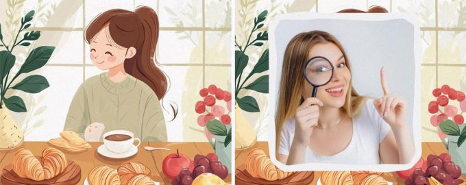 Billederne viser en sød pige, der nyder morgenmaden i sit køkken. Hun drikker kaffe (eller te) med lækre croissanter. Og til dessert forventes hun at få fruiti. Billederne ser næsten identiske ud, men der er fire små forskelle mellem dem. Vil du være i stand til at finde dem?